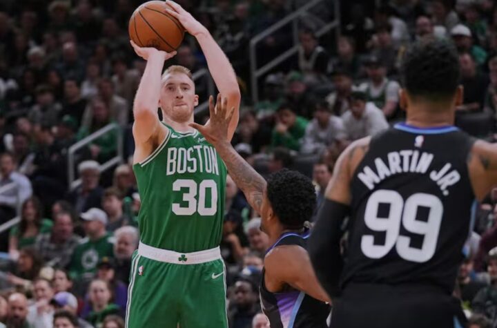Sam Hauser anotó nueve triples, siete de ellos en el tercer cuarto, y terminó...