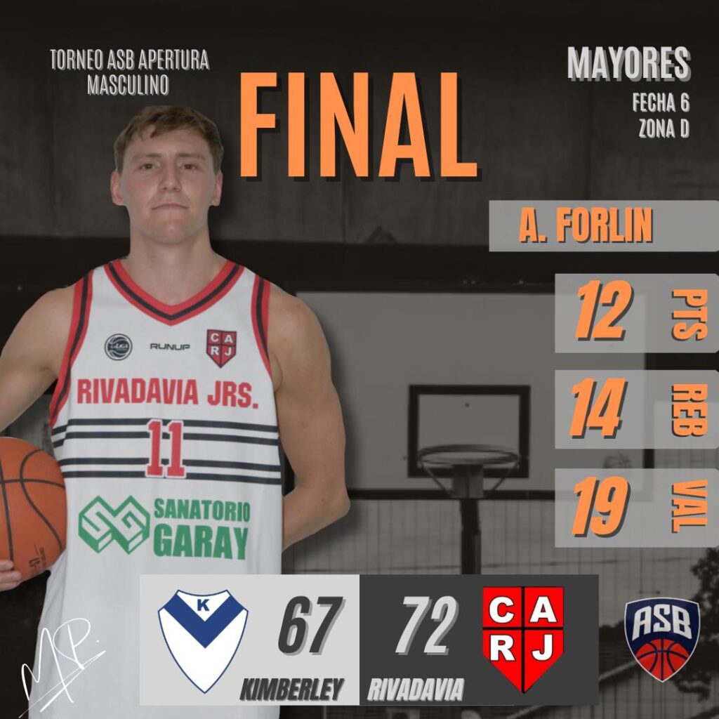 En el Cándido Arrúa, Rivadavia Juniors (4-1) venció de manera apretada a Kimberley (0-5) por 72 a 67, en un cotejo parejo desde el salto inicial.