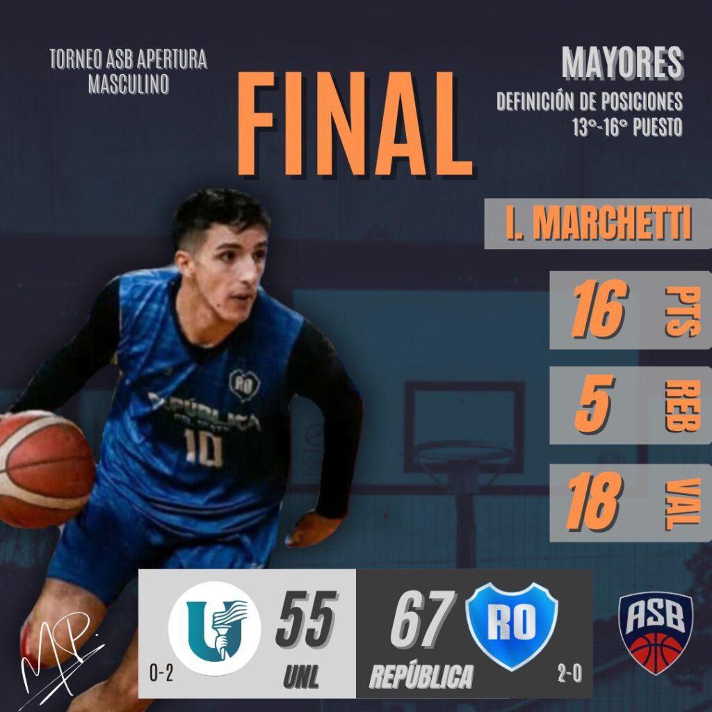 REPÚBLICA 67: Tomás Govone 4, Francisco Neme 4, Ignacio Marchetti 16, Bautista Grosso 11, Alan Duran 7 (FI) Gerónimo Pereyra 0, Vicente Estrubia 0, Juan Bourquín 2, Francisco Belletti 8, Lisandro Govone 5, Pedro Govone 3, Marcos Lescano 0. DT: Lautaro Pereyra.