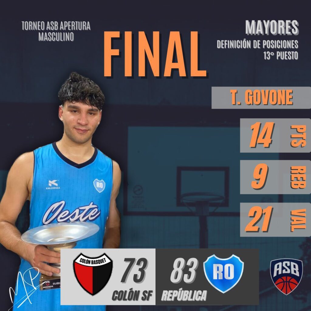 En el Roque Otrino, República del Oeste superó a Colón (SF) por 83 a 73, para terminar su participación en la posición 13 del Torneo Apertura.