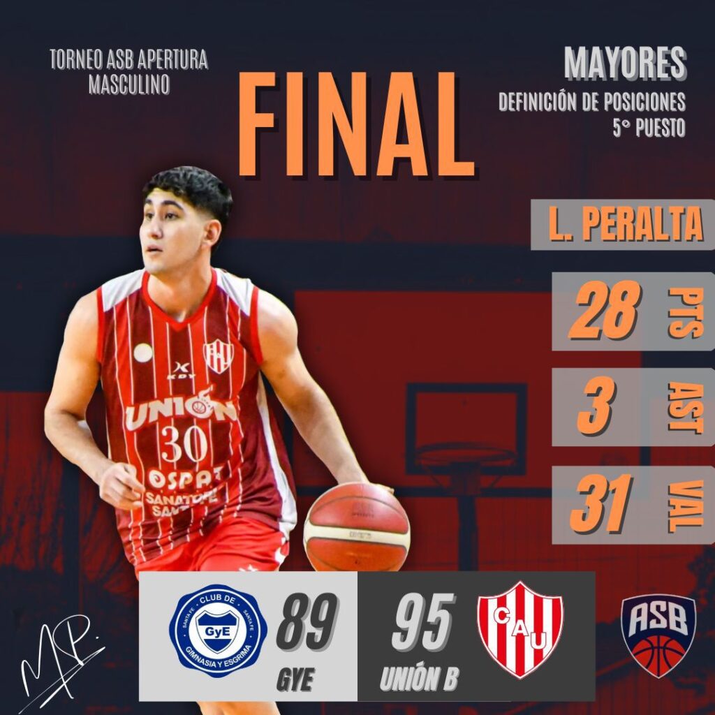 UNIÓN B 95: Francisco Alonso 5, Ulises González 14, Mateo Fabbroni 0, Lucas Peralta 28, Agustín Ferrari 22 (FI) Tomás Peralta 3, Benjamín Jacquier 2, Mateo Belsito 2, Fabricio Gómez 15, Pedro Spajic 4. DT: Federico Spreafico.