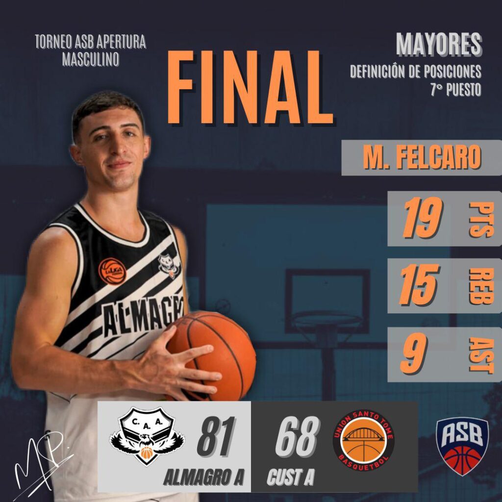 ALMAGRO A 81: Matías Felcaro 19, Mateo Spies 18, Enzo Durigon 9, Gonzalo Lozicki 16, Pablo Spies 4 (FI) Joaquín Jeandrevin 10, Franco Mierke 2, Bautista Ordoñez 3. DT: Leandro Spies.