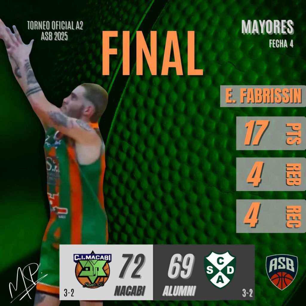 Macabi 72 (Alejo Saidler 17) – Alumni 69 (Nicolás Fernández 19)
