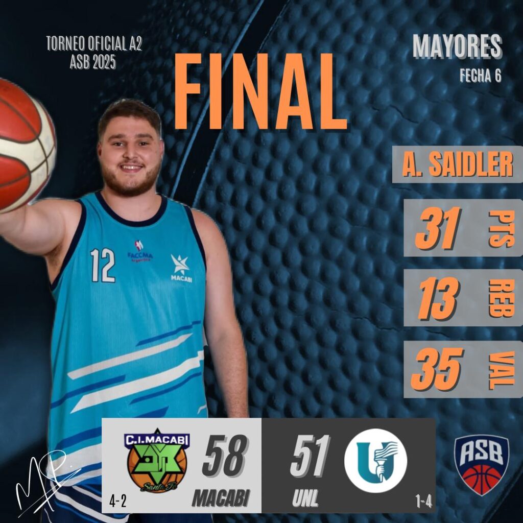 Por su parte, Macabi, en un compromiso de bajo goleo, pudo doblegar a UNL por 58 a 51. La rompió Alejo Saidler.