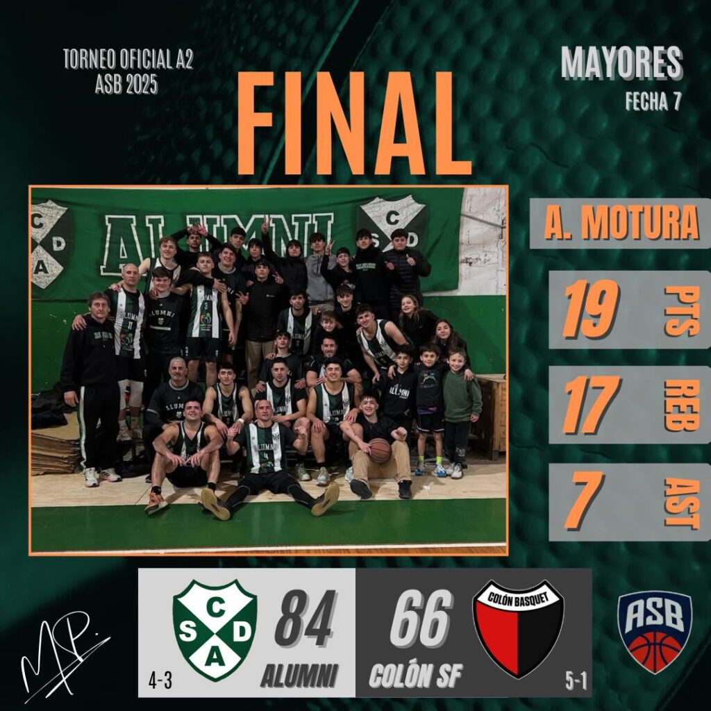 En el Raúl González, Alumni (4-3) refrendó su fuerte localía, al superar a Colón (SF) (5-1) por 84 a 66, para dejar el certamen de ascenso sin invictos.