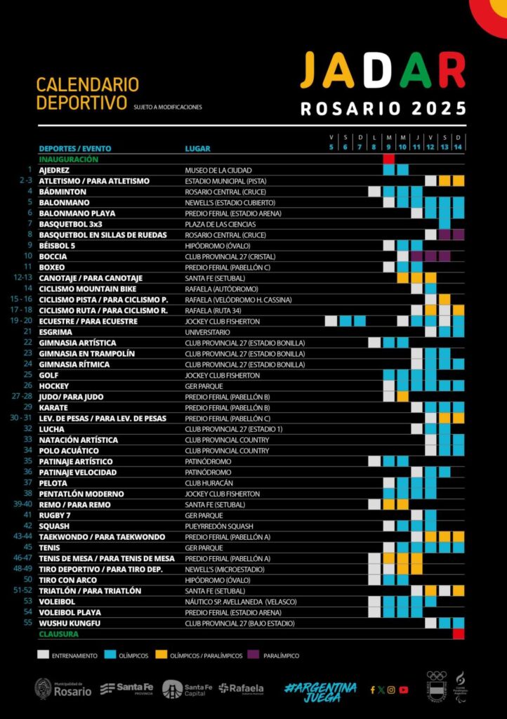 Rosario se prepara rumbo a los Juegos Jadar 2025 (Juegos Argentinos de Alto Rendimiento). El evento ingresó en la cuenta regresiva hacia la apertura del evento, que se desarrollará del 9 al 14 de septiembre y reunirá a más de 3.500 atletas de todo el país en 55 deportes.