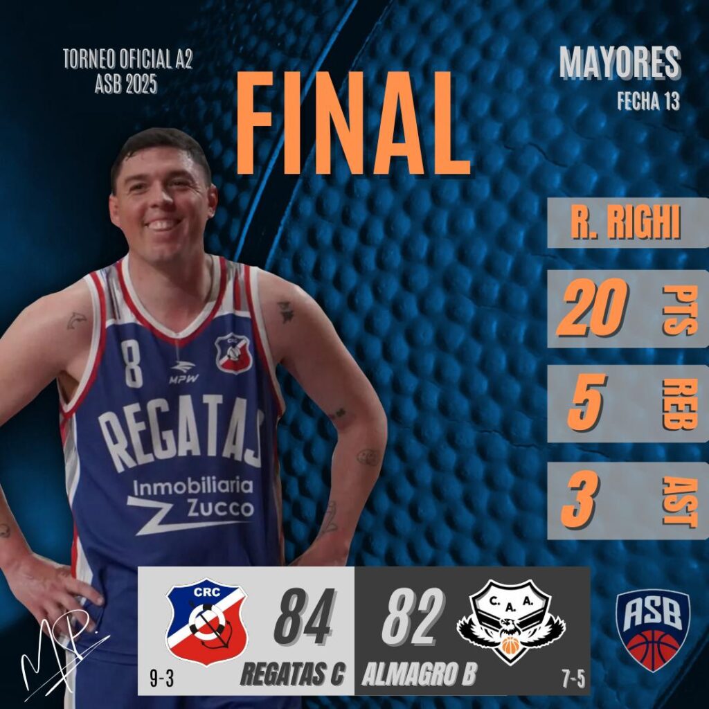 En El Palomar corondino, Regatas (9-3) venció a Almagro B (7-5) por 84 a 82, con lo cual sigue prendido en el lote de elencos que aspiran a meterse en semifinales.