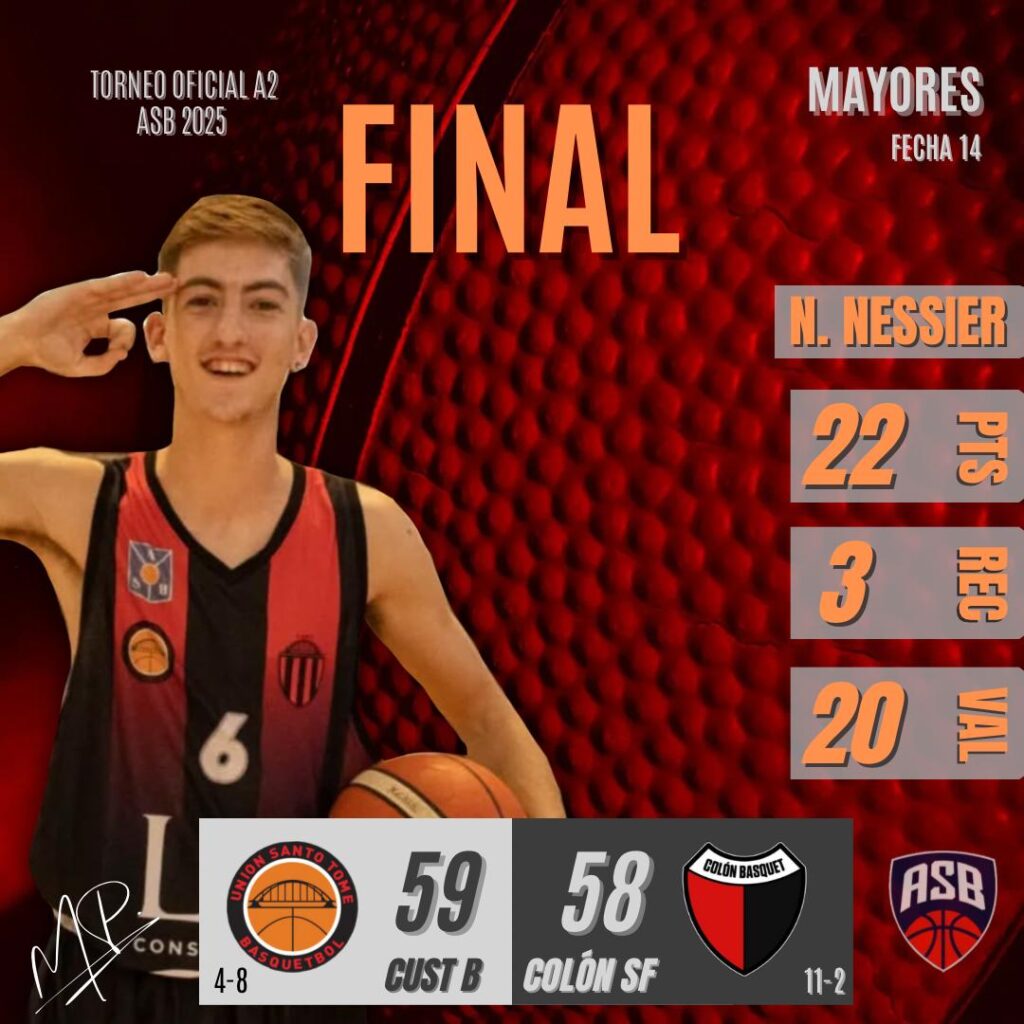 En un vibrante duelo de principio a fin, CUST B (4-8) superó a Colón (SF) (11-2) por 59 a 58, en un adelanto por una nueva jornada del ascenso local.