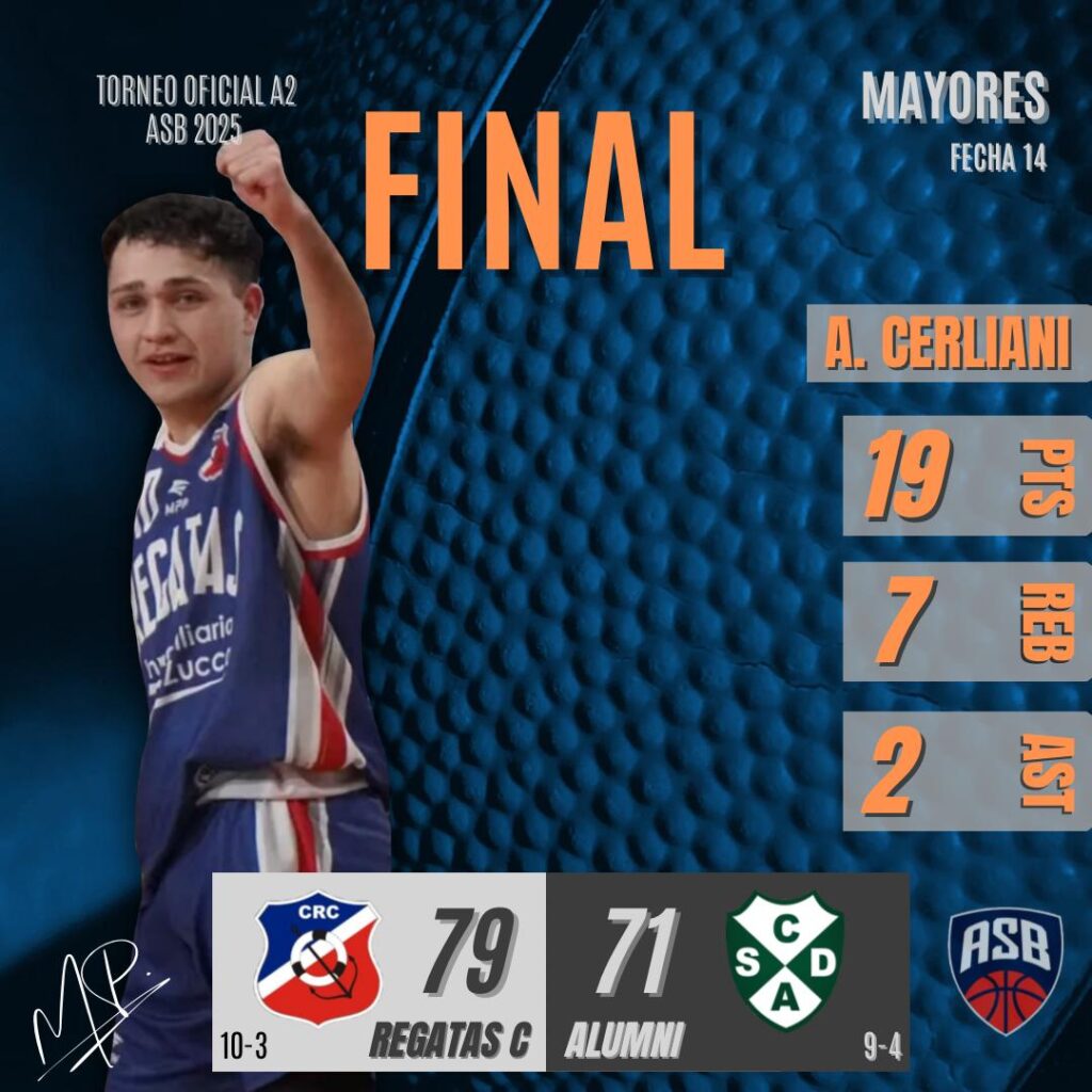 Como sucedió frente a Almagro B, esta vez Regatas Coronda (10-3) quedó como único escolta de la zona A2, al batir a Alumni (9-4) por 79 a 71, después de igualar en 62 al cabo del tiempo regular.