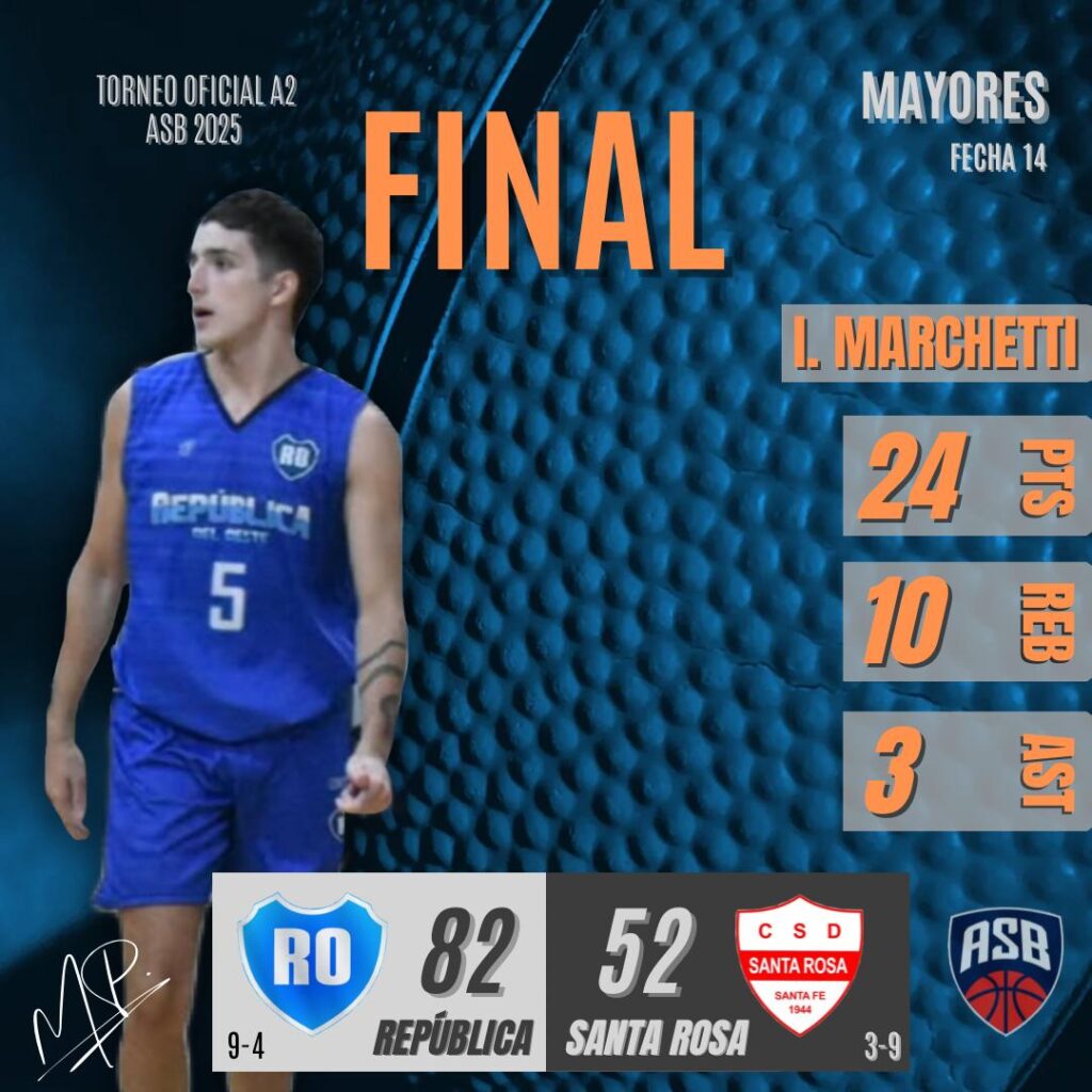 REPÚBLICA 82: Marcos Lescano 6, Francisco Neme 21, Ignacio Marchetti 24, Lautaro Recce 6, Pablo Grismado 0 (FI) Gerónimo Pereyra 3, Alejo Bieler 4, Agustín Ríos 9, Pedro Govone 1, Bautista Grosso 2, Enzo Pitano 4, Alan Duran 2. DT: Lautaro Pereyra.