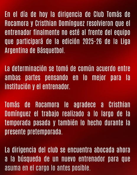 A pocos días del inicio de la temporada, donde su estreno está pautado para el 5 de noviembre en el Julio Paccagnella ante Deportivo Viedma, Tomás de Rocamora anunció la partida del DT Cristhian Domínguez.