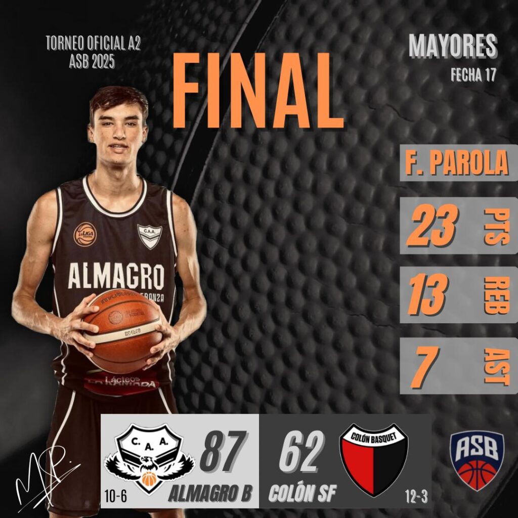 En el Juan Carlos Spies, Almagro B (10-6) doblegó a Colón (SF) (12-3) por 87 a 62, en otro de los partidos que completó la Fecha 17 de la zona A2.
