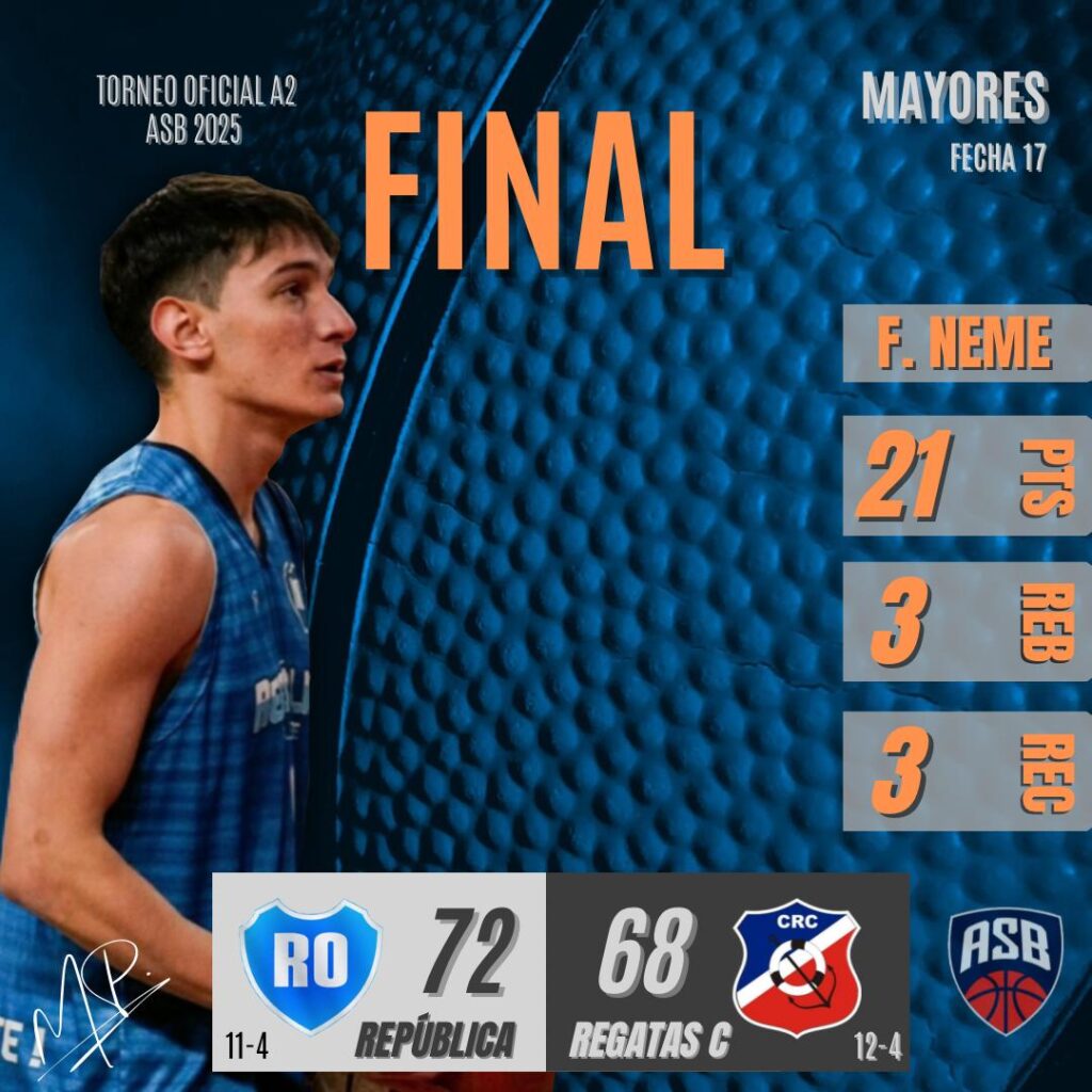 República del Oeste 72 (Francisco Neme 21) – Regatas Coronda 68 (Kevin Flores 20)