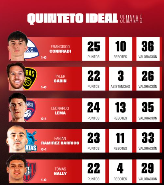 Como es una costumbre, la Asociación de Clubes en su web oficial dio a conocer el Quinteto Ideal de la quinta semana de acción, donde se alistó Leonardo Lema (Quimsa), jugador que ascendió con Unión a la elite.
