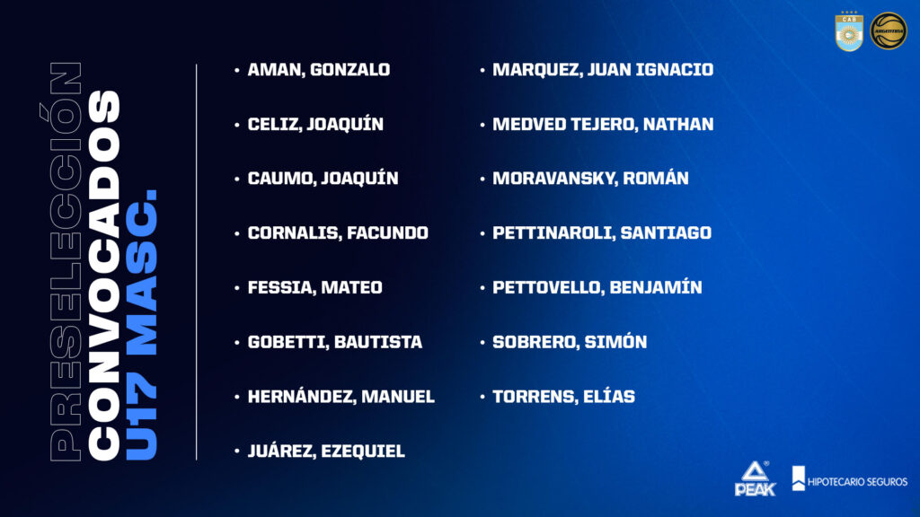 El cuerpo técnico que encabeza Mauro Polla dispuso la citación de 15 jugadores, 11 de los cuales estuvieron presentes en la excursión a Uruguay, donde la camada disputó dos amistosos. A ellos se le suman cuatro jóvenes provenientes del extranjero. De esta nómina saldrán los 12 que representarán a nuestro país en la primera competencia oficial del grupo. Simón Gradín, del Movistar Estudiantes de Madrid, ha sido descartado del torneo por lesión.