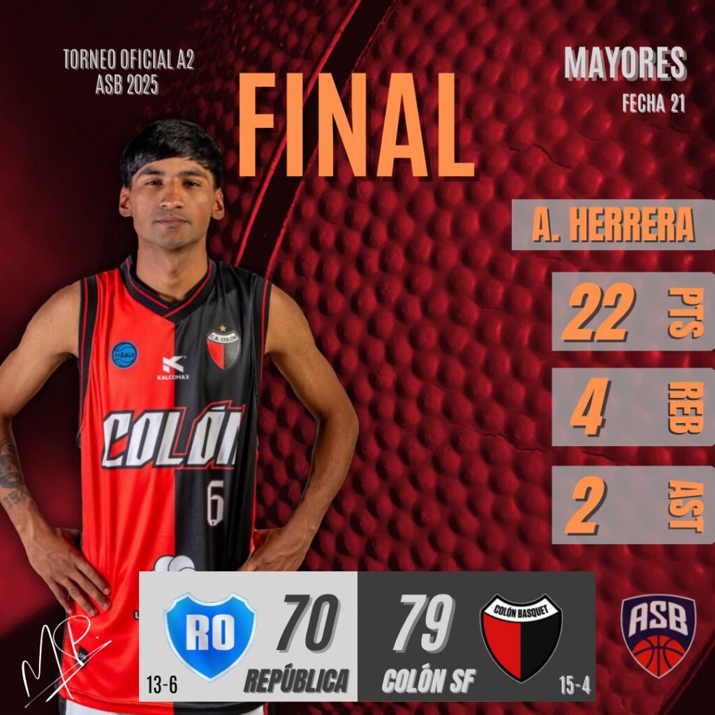 República del Oeste 70 (Alejo Bieler 17) – Colón (SF) 79 (Adrián Herrera 22)