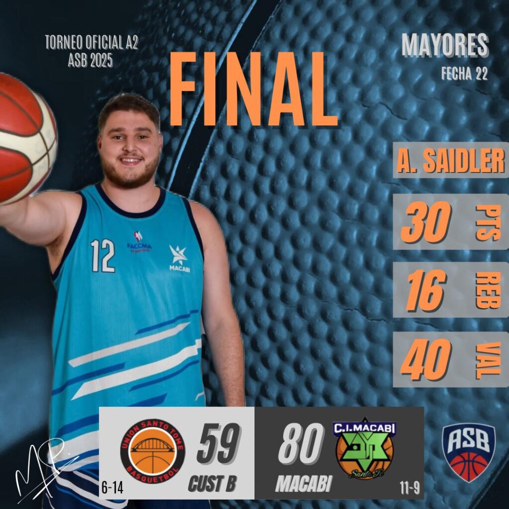 Macabi (11-9) no tuvo problemas en doblegar a CUST B (6-14) por 80 a 59, en uno de los partidos que completó la fase regular de la zona A2.