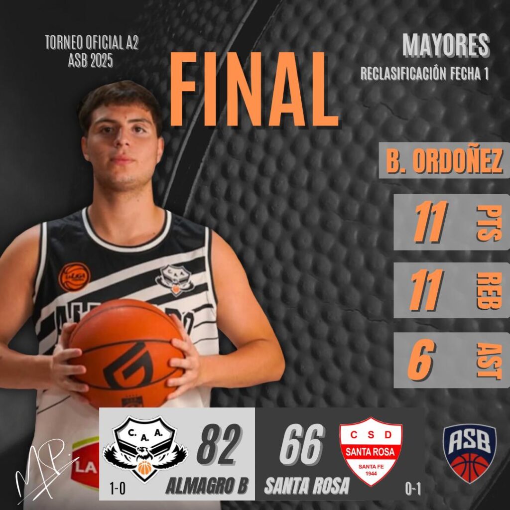 ALMAGRO B 82: Ezequiel Heinzen 18, Juan Meneghello 19, Felipe Gorosito 12, Guillermo Gonem 4, Juan Tkaczyk 6 (FI) Tomás Alzugaray 3, Juan Fontana 3, Ramiro Andersson 6, Bautista Ordoñez 11, Ignacio Burgi 0. DT: Alejandro Rippstein.