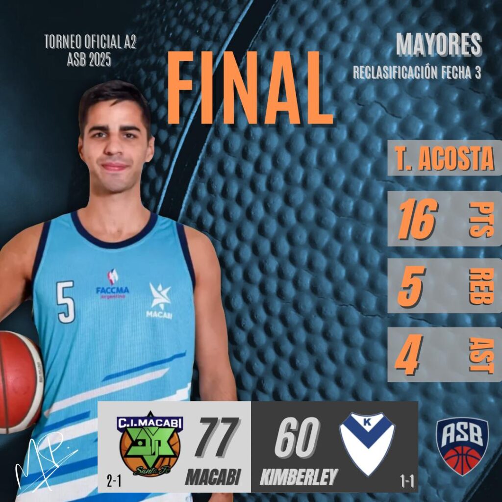 En Junín y Belgrano, Macabi (2-1) superó a Kimberley (1-1) por 77 a 60, en un partido que completó la tercera fecha del mini certamen que le brindará ubicaciones finales a varios elencos en A2.