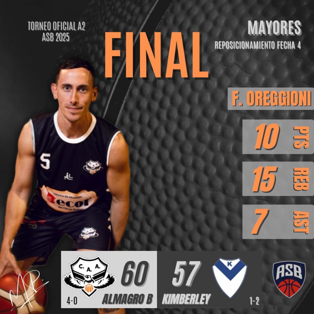 En el Juan Carlos Spies y con un triple de Felipe Gorosito sobre el final, Almagro B (4-0) superó a Kimberley (1-2) por 60 a 57, en el inicio de la Fecha 4 del mini certamen que define posiciones en la zona A2.