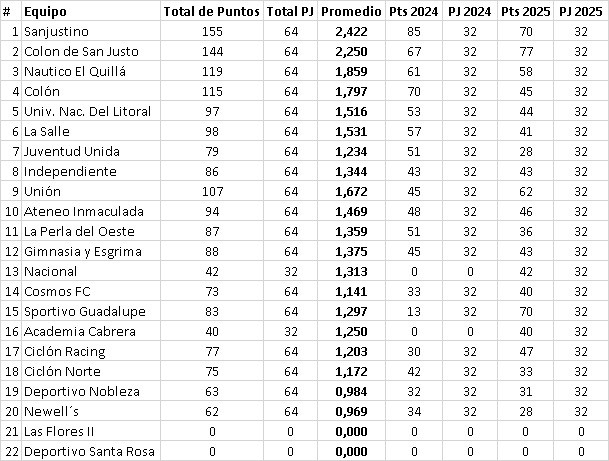 Newell´s de barrio Roma es el que tiene el promedio más bajo de todos los equipos que siguen desde la temporada 2025, debido al bajo rendimiento realizado en los últimos dos años. 34 puntos logrados en 2023 y tan sólo 28 en 2024, deja un promedio de 0.969, el más bajo de todos. En los próximos días anunciará a un nuevo cuerpo técnico.