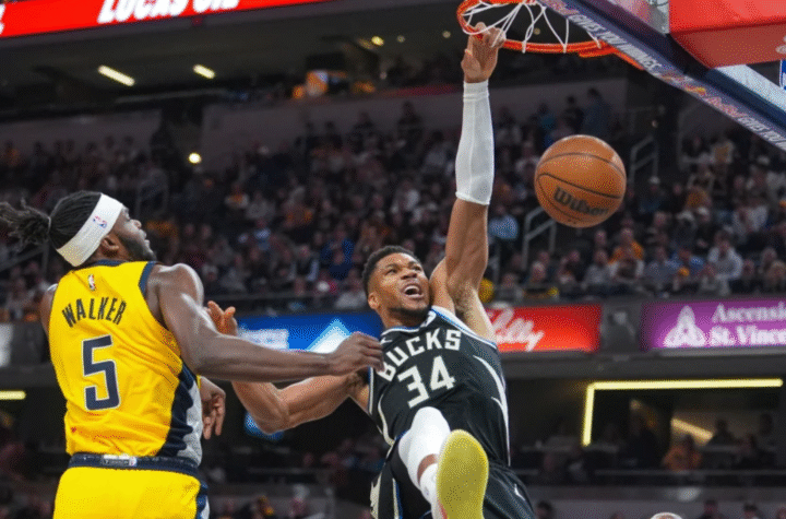 Giannis Antetokounmpo encestó un tiro de 17 pies justo al sonar la bocina para...
